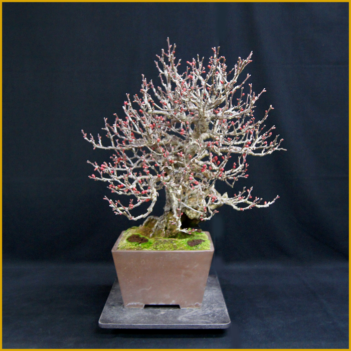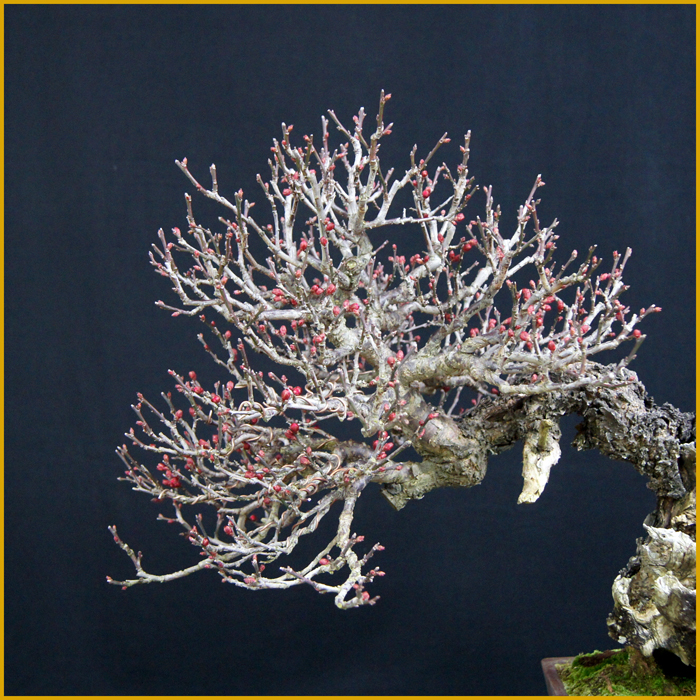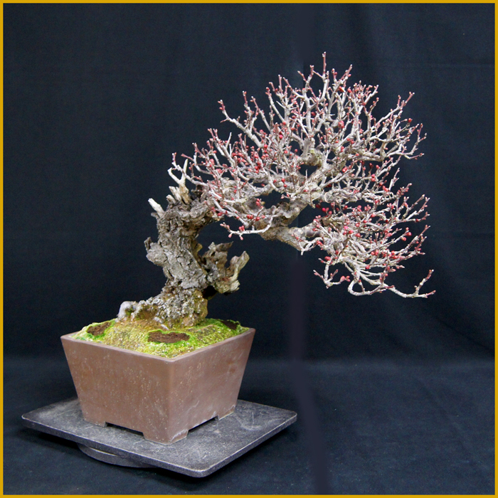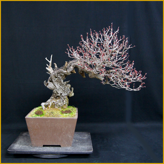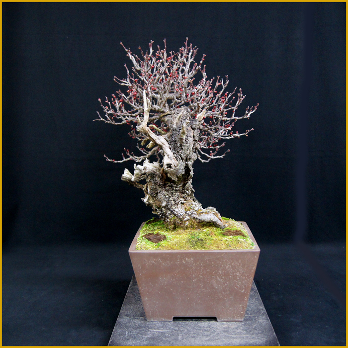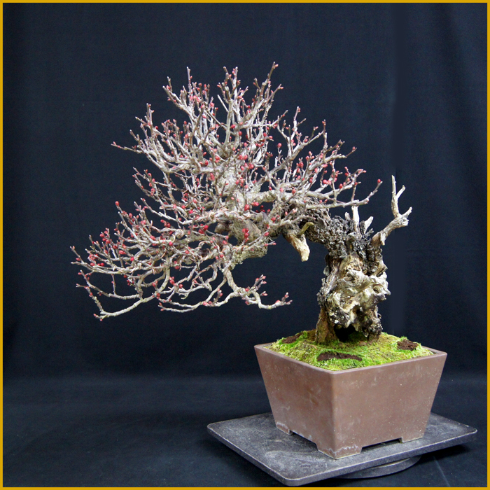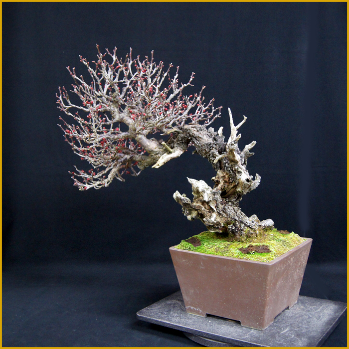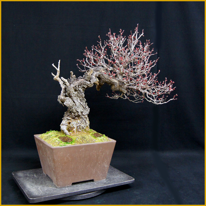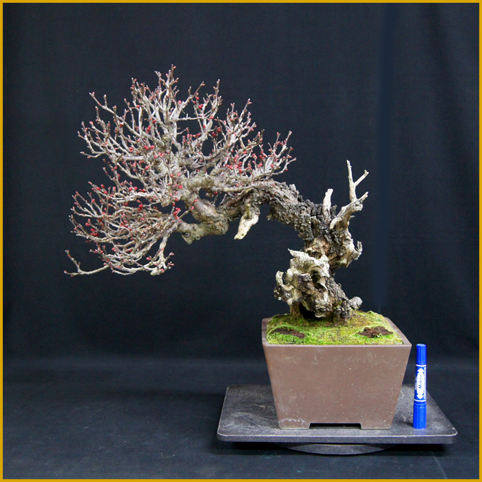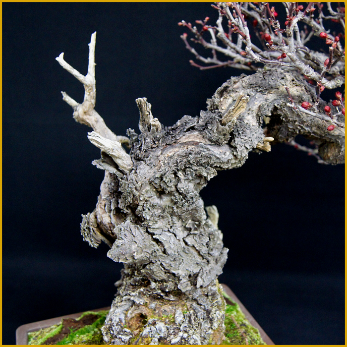 躍動的な幹模様に加えて縮緬肌になった風格が素晴らしい緋梅です。