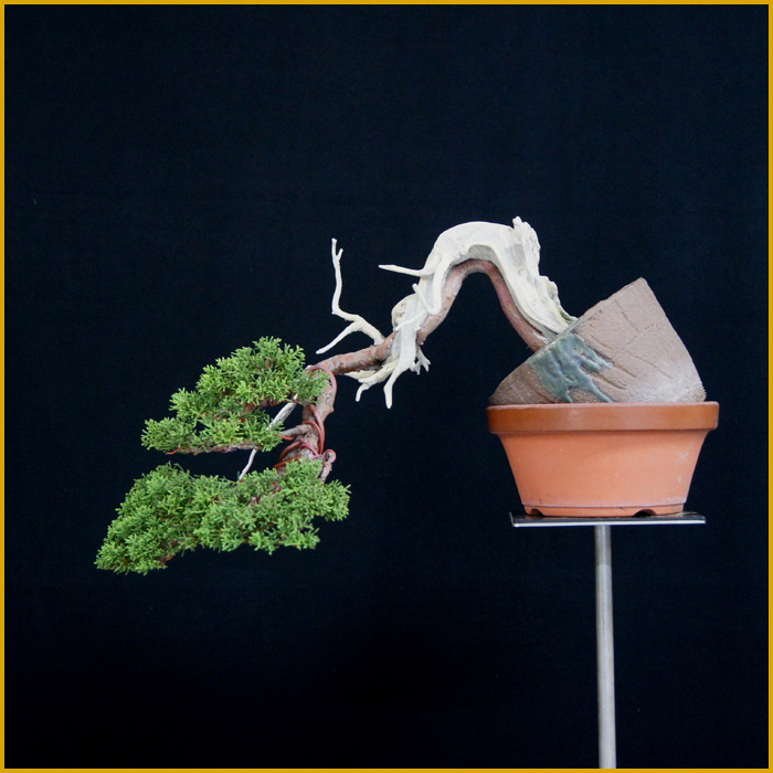 躍動的なジンに対して細い水吸いが相まって、洒落た姿をなした真柏です。