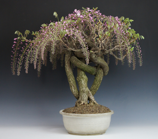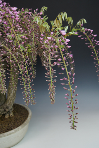 魅力的な花が満遍なく付いていて、躍動感のある面白い幹模様の古い藤です。