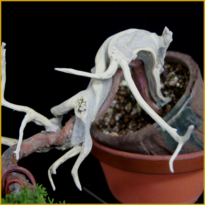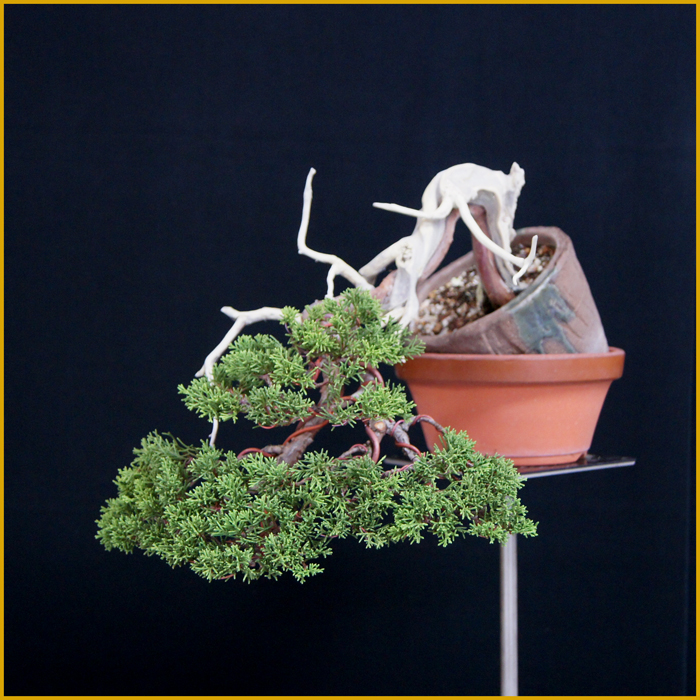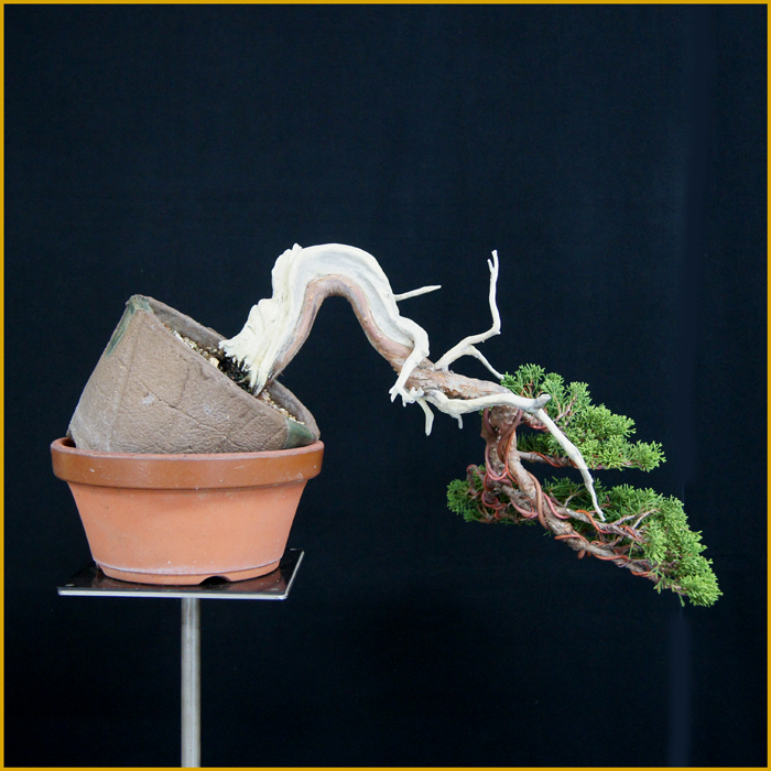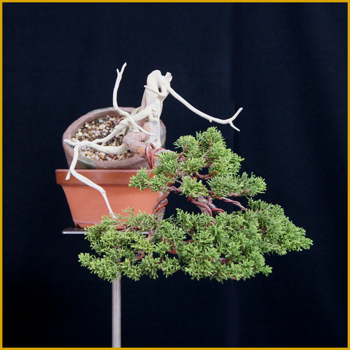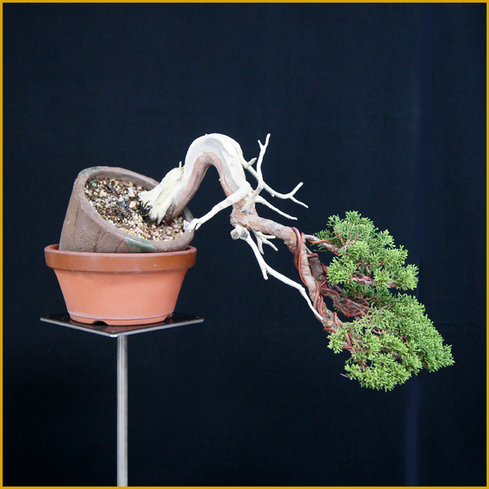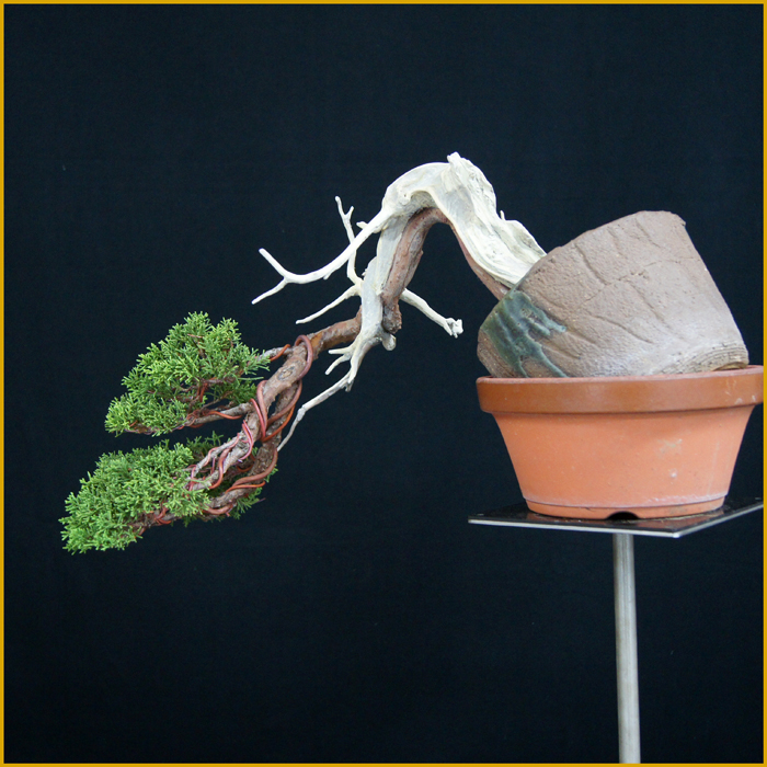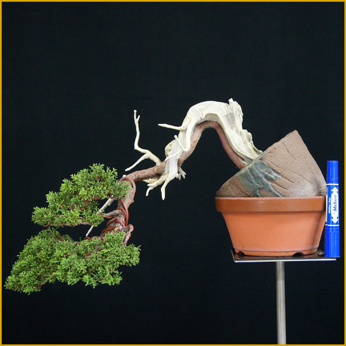 躍動的なジンに対して細い水吸いが相まって、洒落た姿をなした真柏です。